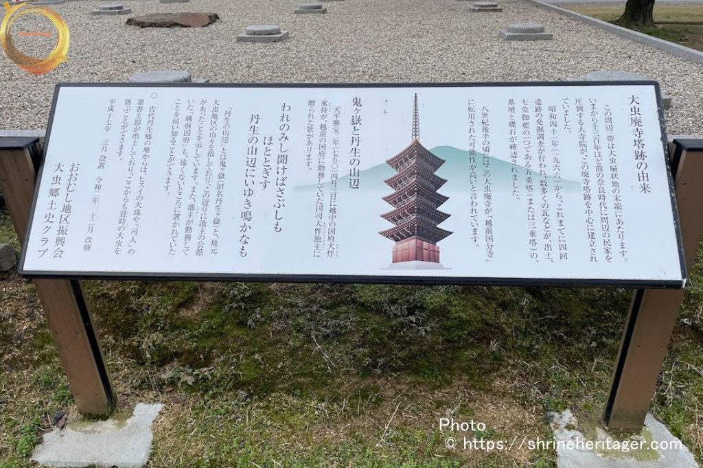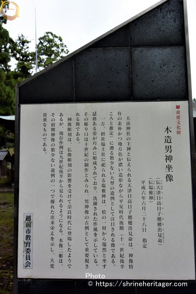 ・・・神社にては 縣社 大虫神社あり、往古 名神大社なりしを以て特に著名なり、天正の初までは末社四十八社、社家百二十戸、社領八千二百石を有せしが、四年四月二十四日 柴田勝家の兵燹に罹りて、悉く烏有に歸し、剩へ神領を掠奪せられしを以て、一時非常に衰退せしが、十ー年同月同日羽柴秀吉、勝家を北莊に攻め亡して、凱旋の途に就きし時、其の臣 丹羽長秀に命じて神祠を再建せしむ。