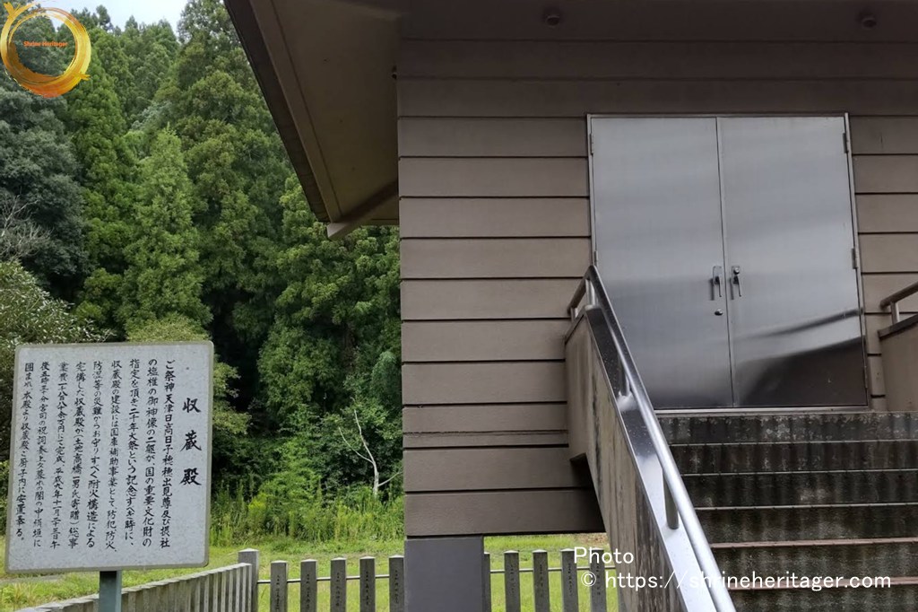 寶物は天國の太刀(光仁天皇 天應元年勅納)驛路の鈴(垂仁天皇二十六年勅使として當社へ参向せる家原氏の寄附)瓶子(稱德天皇 大嘗會 越前園悠紀方にト定の時 當社を斎庭とせられしにより勅納)等とす。境内神社