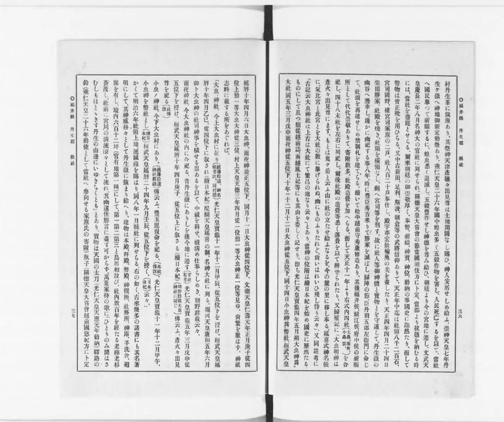 續日本紀、寶龜四年五月乙亥朔、爲ニ大社、同十一年十二月甲辰、越前國丹生郡大虫神叙ニ從五位下、延暦十年四月庚子、叙ニ越前國大虫神社從五位下、〔下は上の誤なるべし〕