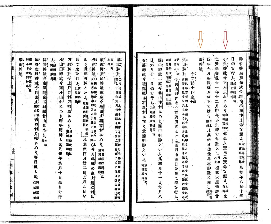 雷神社(大山祇命) 若宮神社(鵜草葺不合尊)御神體は 木造の御像なりといふ、かの延喜式に、丹生郡大虫神社〔名神大〕、同神名帳考證に「大山咋神・古事記云、大山咋神 亦名 山末之大主神、丹後國大虫神社、太平記十九云、織田大虫等」と記載しある社なり、