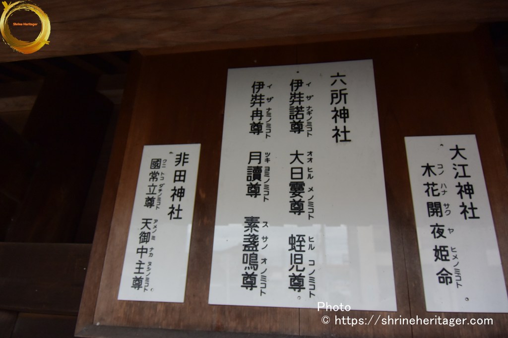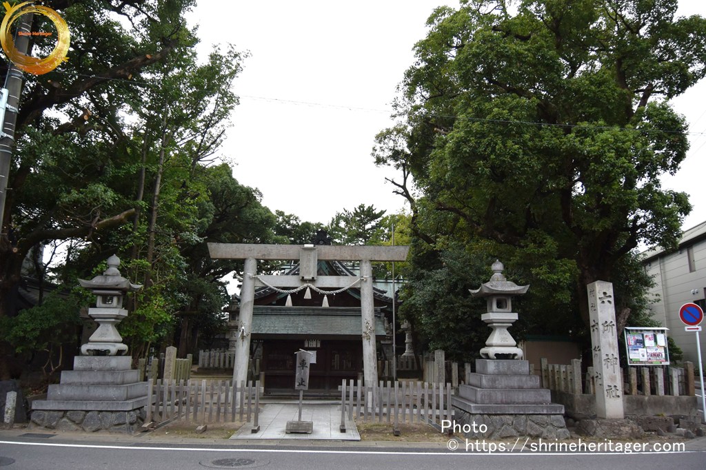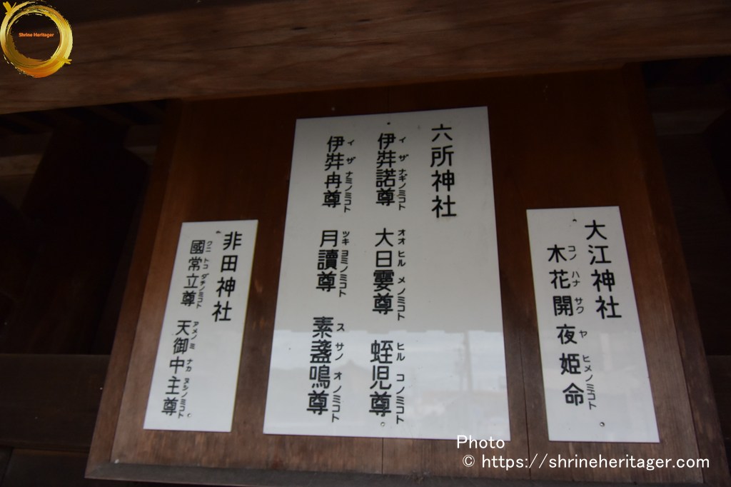 六所神社(ろくしょじんじゃ)は 創建年代は不祥 本殿の両脇にある2つの境内社(・非多神社・ 大江神社)が式内論社とされていて〈①延喜式内社 尾張國 春日部郡 非多神社(ひたの かみのやしろ) ②延喜式内社 尾張國 春日部郡 乎江神社(をえの かみのやしろ)〉 二つの式内社の論社となっています