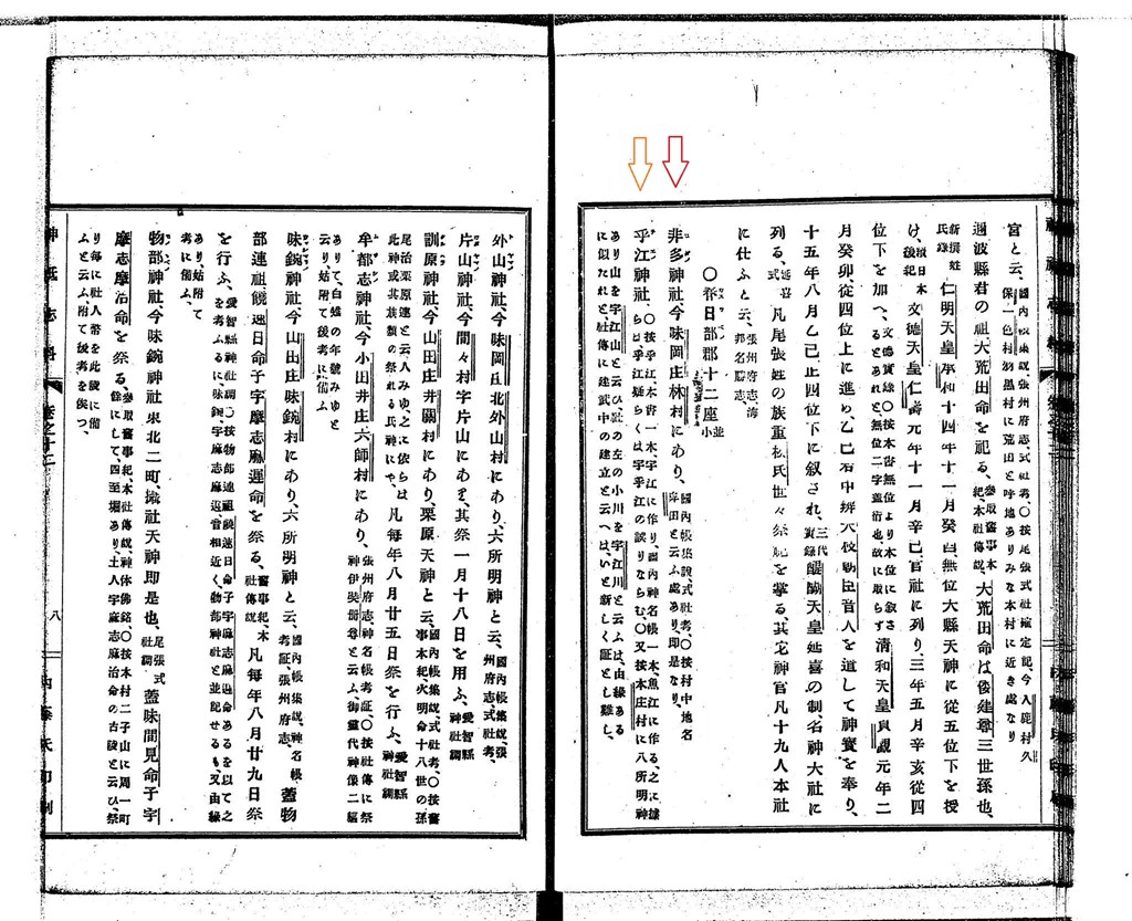 〔○按 乎江、本書一本、宇江に作り、國内神名帳一本、魚江に作る、之に據らは、乎江疑らくは宇乎江の誤りならむ、○又按 本庄村に八所明神あり 山を宇江山と云ひ、社の左の小川を宇江川と云ふは、由縁あるに似たれど、社傳に建武中の建立と云へは、いと新しく証とし難し、〕