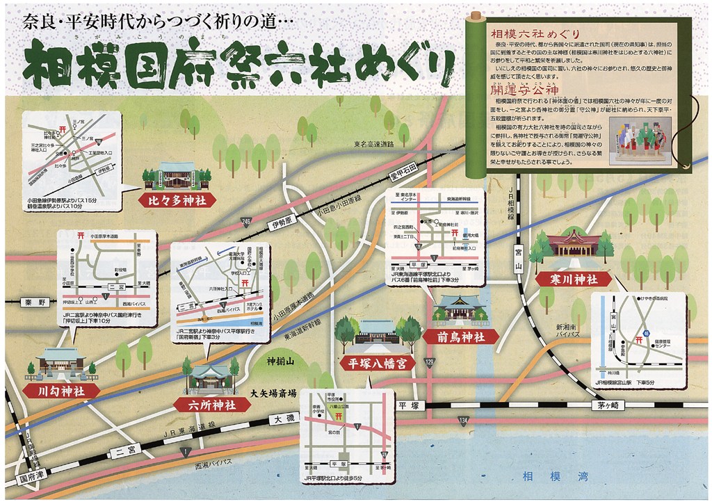国府祭は毎年五月五日 相模の六社〔相模国の・一之宮 寒川神社・二之宮 川勾神社・三之宮 比々多神社・四之宮 前鳥神社・五之宮 平塚八幡宮・総社 六所神社〕が祭場である神揃山(かみそろいやま)・逢親場(おおやば)に集う祭りで 神奈川県の無形民俗文化財に指定されています