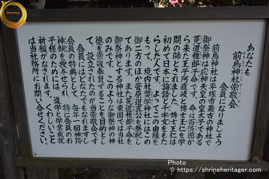 前鳥大神(菟道稚郎子命)は、第十五代應神天皇の皇太子で、幼い頃より聡明で天皇の寵愛をうけられました。当時朝廷に来ておらてました百済国の王子阿直岐から、帝王の道を学ばれ、ついで博士王仁を招かれ学問の道をひらかれたことは、歴史の伝えるところであり、論語・千字文などの漢籍が、はじめて我が國に渡来したのもこのときであります。よって昔より修学の神、学問の祖神として広く尊崇されるゆえんなのであります。