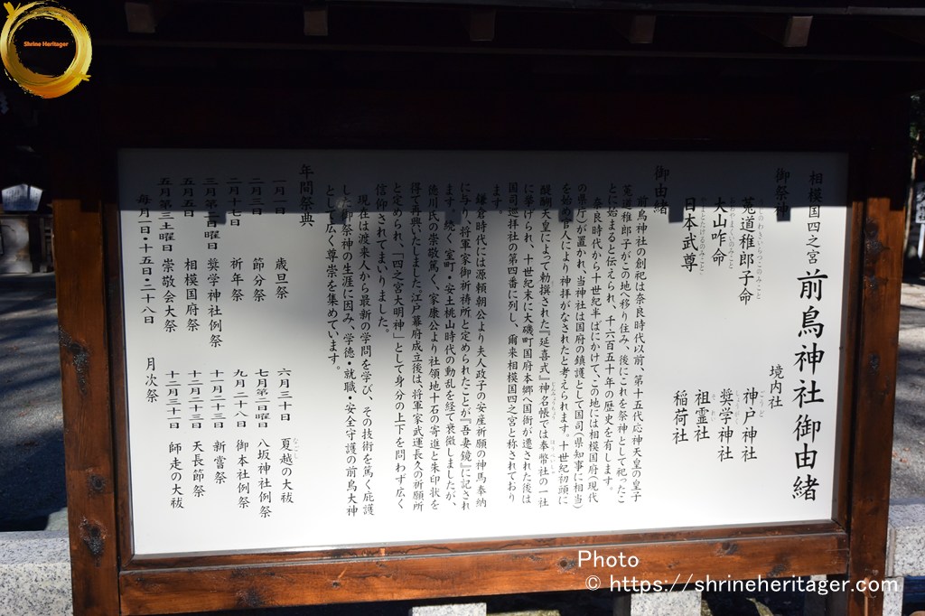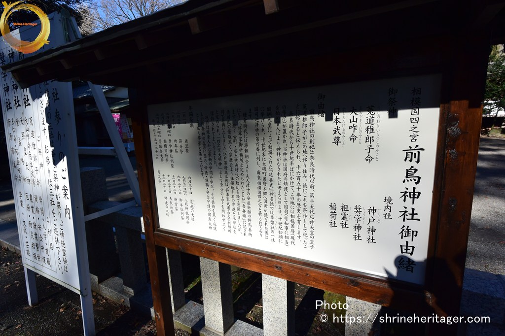 御神體は、束帯、木像、高さ一尺五寸と新編相摸風土記に見えたり、前鳥、古く前取とも書す、神社覈録に云く、祭神 天廣鳥命〔地名記〕と、明治維新の際社領を上地し、六年七月十五日、郷社に列す。