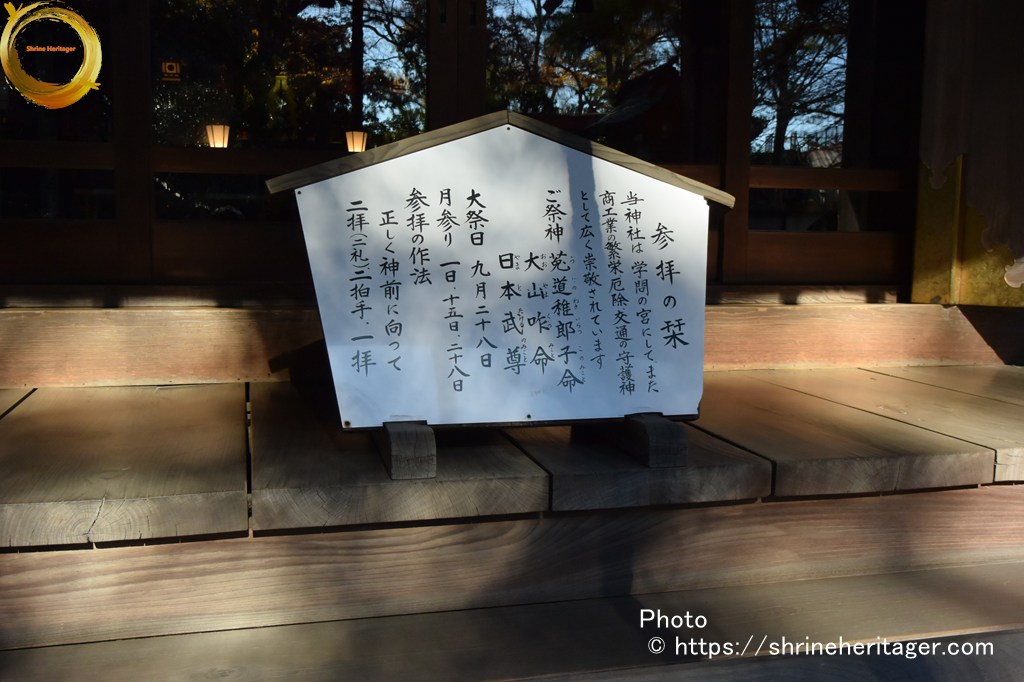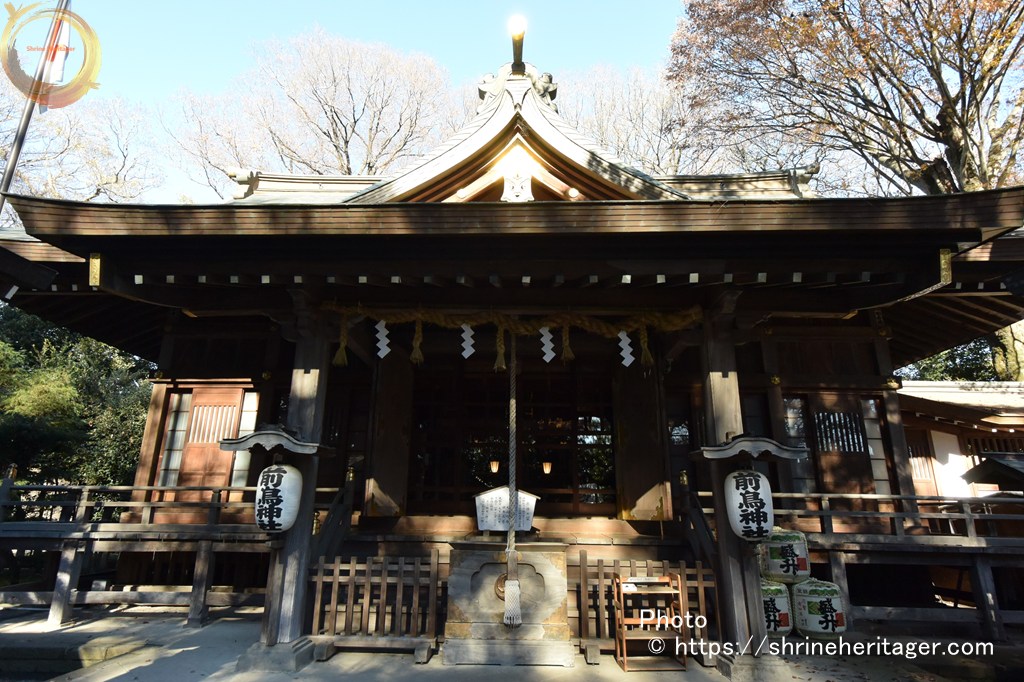 またこの時代に、日本の農業、土木建築等が急速に発展したのも、学問のほかに産業技術導入をはかられたからにほかなりません。まことに國運興隆の基をきずかれたこと、菟道稚郎子命に負うこと最も大であると申せられます。菟道稚郎子命を祭神としてまつる神社は極めてまれで、全国では京都府宇治市にある宇治神社と前鳥神社の2社であります。したがって当神社は関東唯一の学問・文化の祖神をまつる古社であるといわれるものであります。
