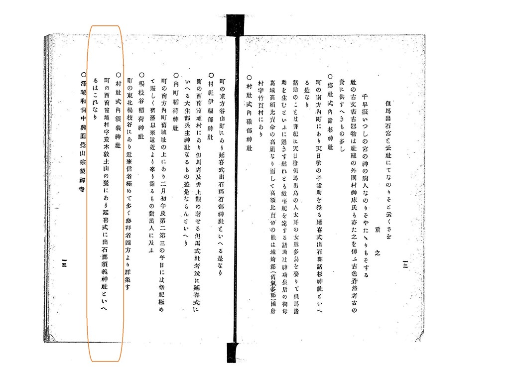 町の西南 室地村字荒木 敦土山の麓にあり 延喜式に出石郡 須義神社といへるはこれなり