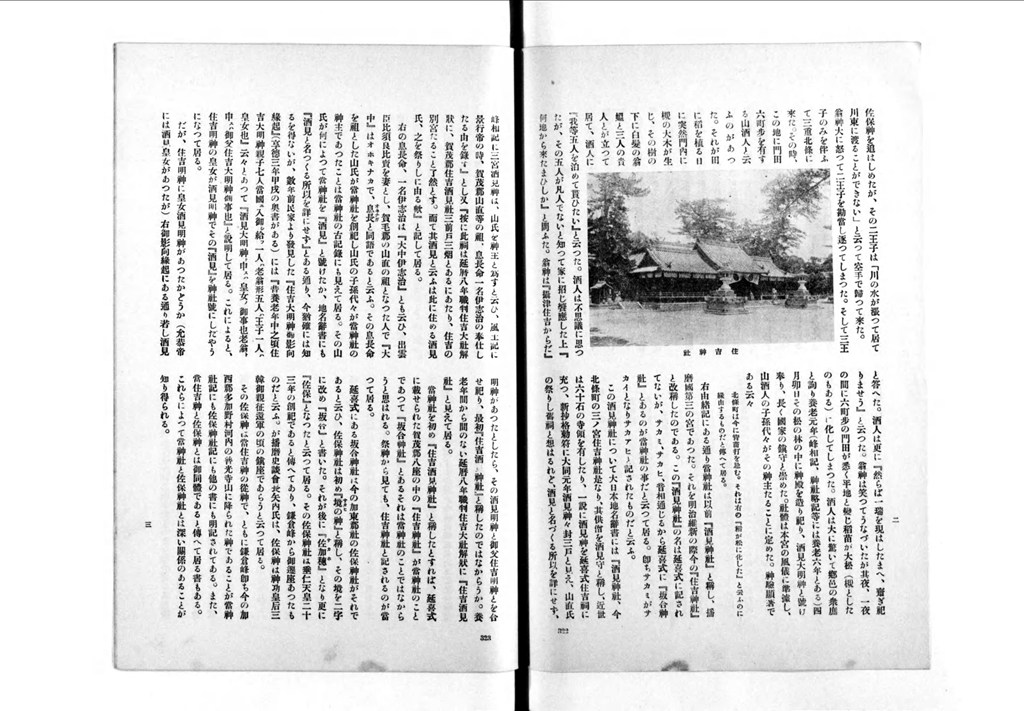 右由緒記にある通り當神社は以前『酒見神社』と稱し、播磨國第三の宮であつた。それを明治維新の際 今の『住吉神社』と改稱したのである。この『酒見神社』の名は延喜式に記されてないが、サカミ、サカヒ、音相通じるから延喜式に『坂合神社』とあるのが當神社の事だと云って居る。卽ちサカミがサカイとなりサカアヒと記されたものだと云ふ。