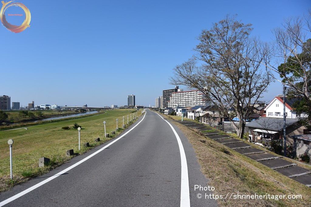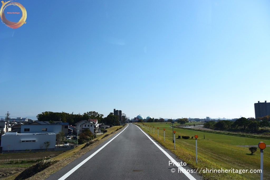 庄内川の支流 矢田川 北岸の土手沿いに南を向いて鎮座しています