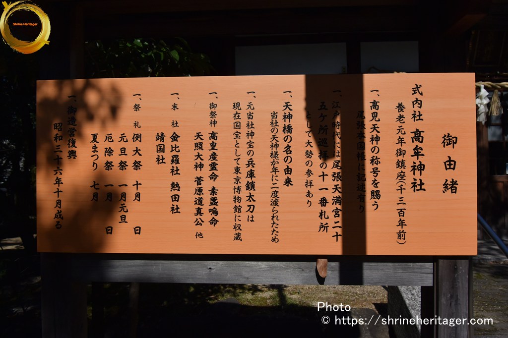「延喜式」に春日部高牟神社、「本国帳」には従3位高牟天神、「尾張本国内神明帳」に従3位上高見天神と記るす古社なりと。
