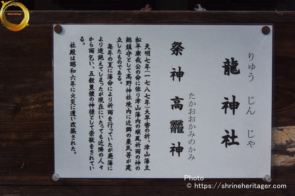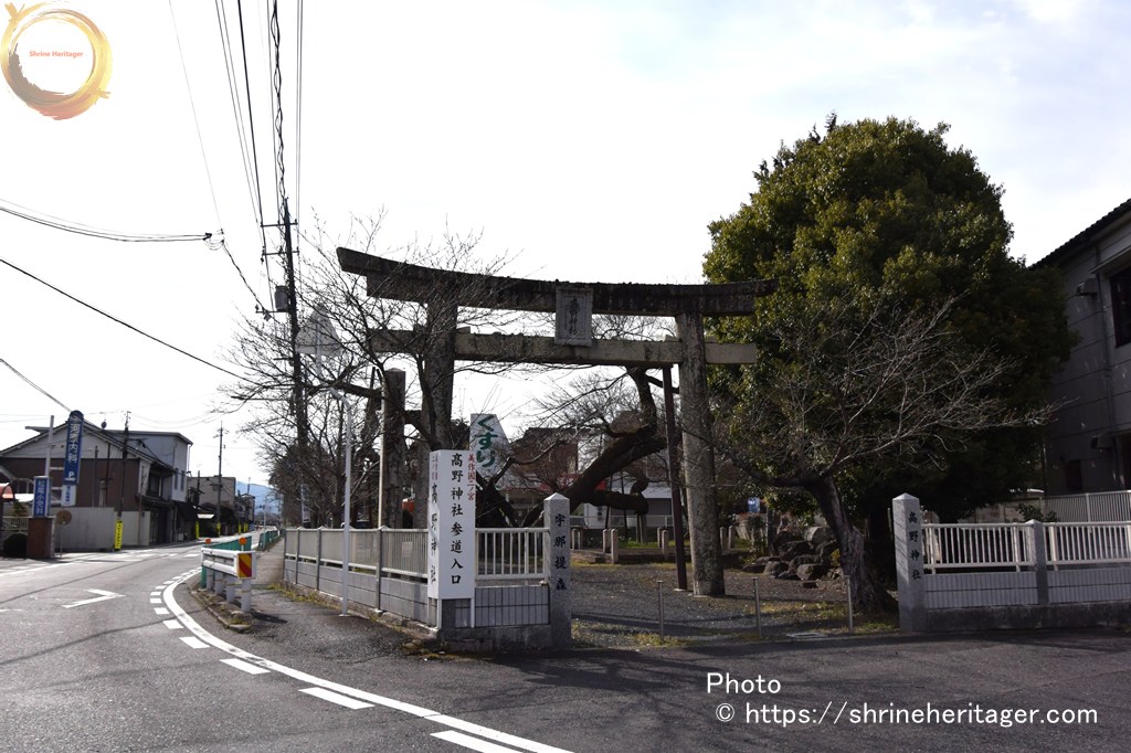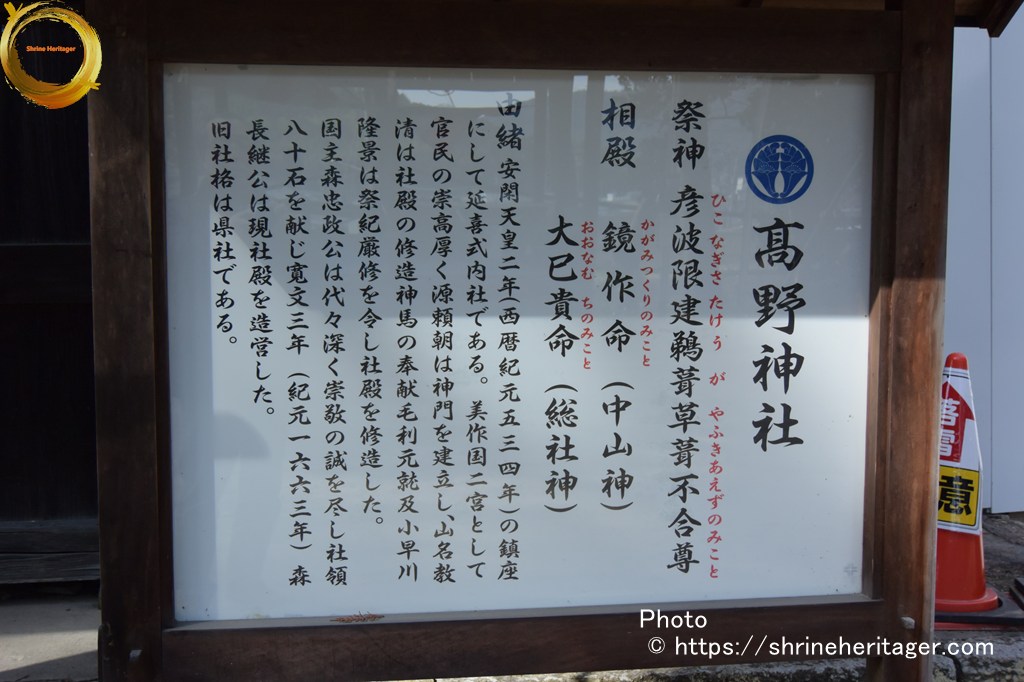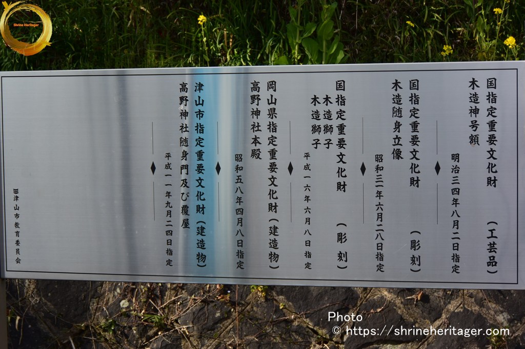 「貞觀十七年三月二十九日壬子晦、授ニ 美作國從五位上 高野神 正五位下、」社領は慶長九年三月森忠政三十石を寄附し、同年九月十七石に加増し、寛永十二年正月 森長繼更に十石を加増せり(作陽誌)、神體は木像とす、明治六年縣社に列す。