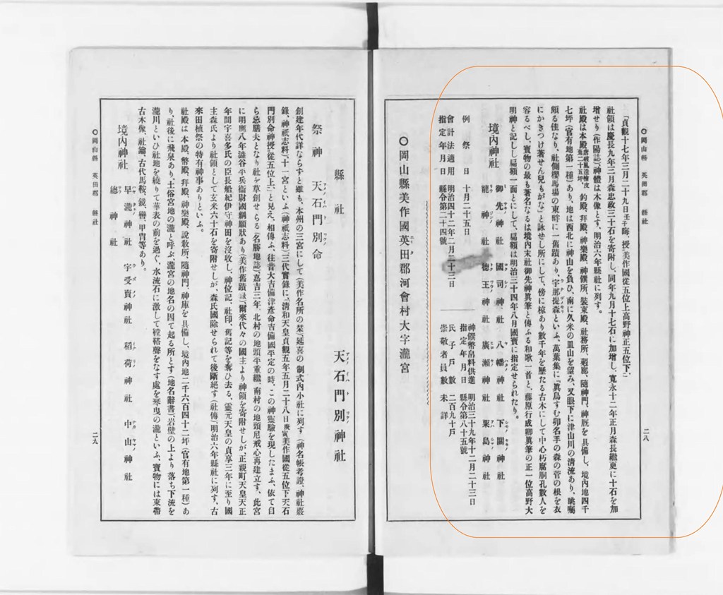 〇今西西條郡神戸郷御岩村に在す、〔作陽志、式社考、〕例祭 月 日、