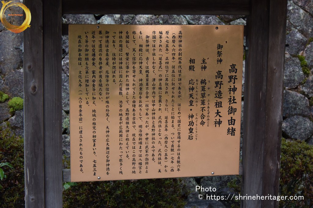 高野神社の創祀年代は不詳であるが、はじめて国史に登場するのは貞観六年(西暦八六四年)従五位に叙せられたことに始まる。ついで貞観一七年(西暦八七五年)正四位下に昇叙され、さらに、延喜五年(西暦九〇五年)から編纂された「延喜式」の神名帳に登載され、式内社となった。式内社は、美作国では十社しかなく、津山市内では中山神社と高野神社のみである。