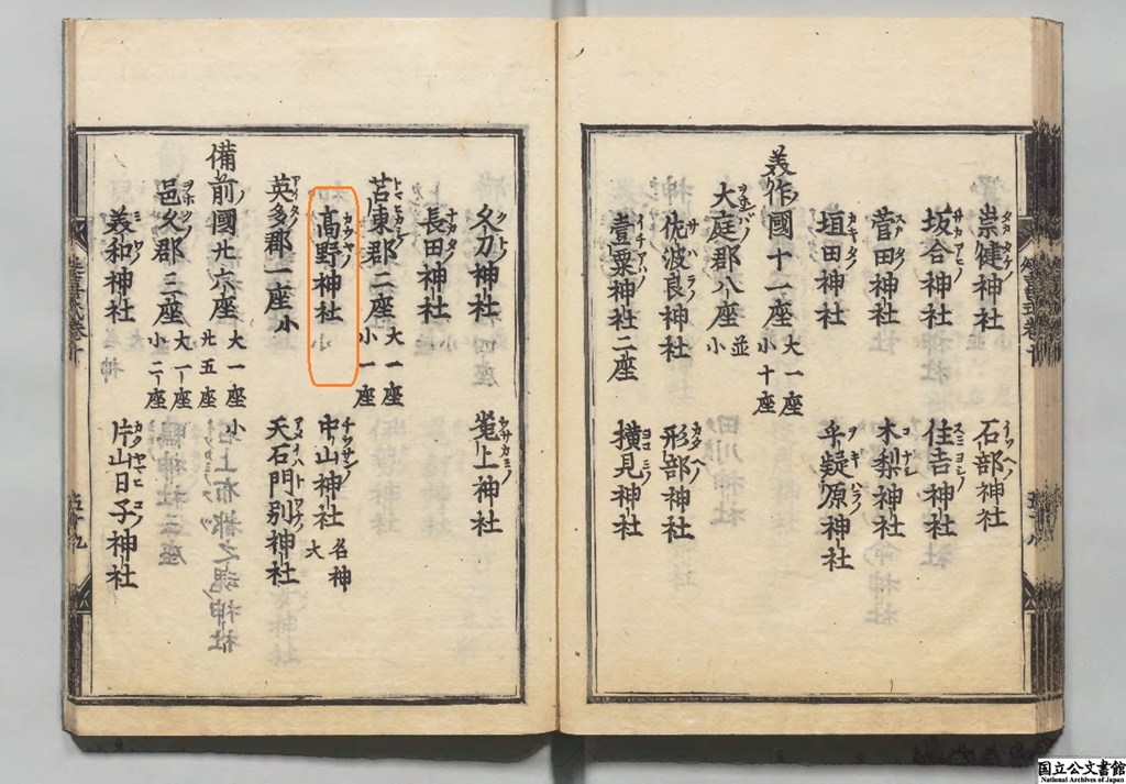 延喜式神名帳』(927年12月編纂)に所載される「髙野神社」について