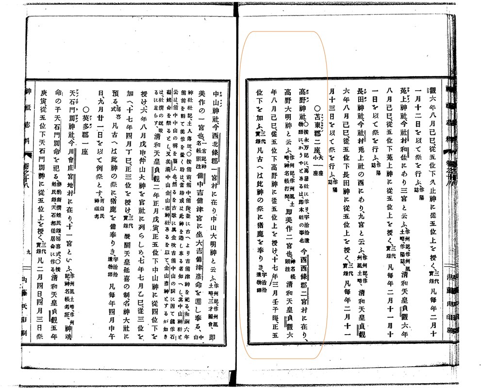 清和天皇 貞観八年八月十五日己巳 美作國從五位下 高野神 授從位上