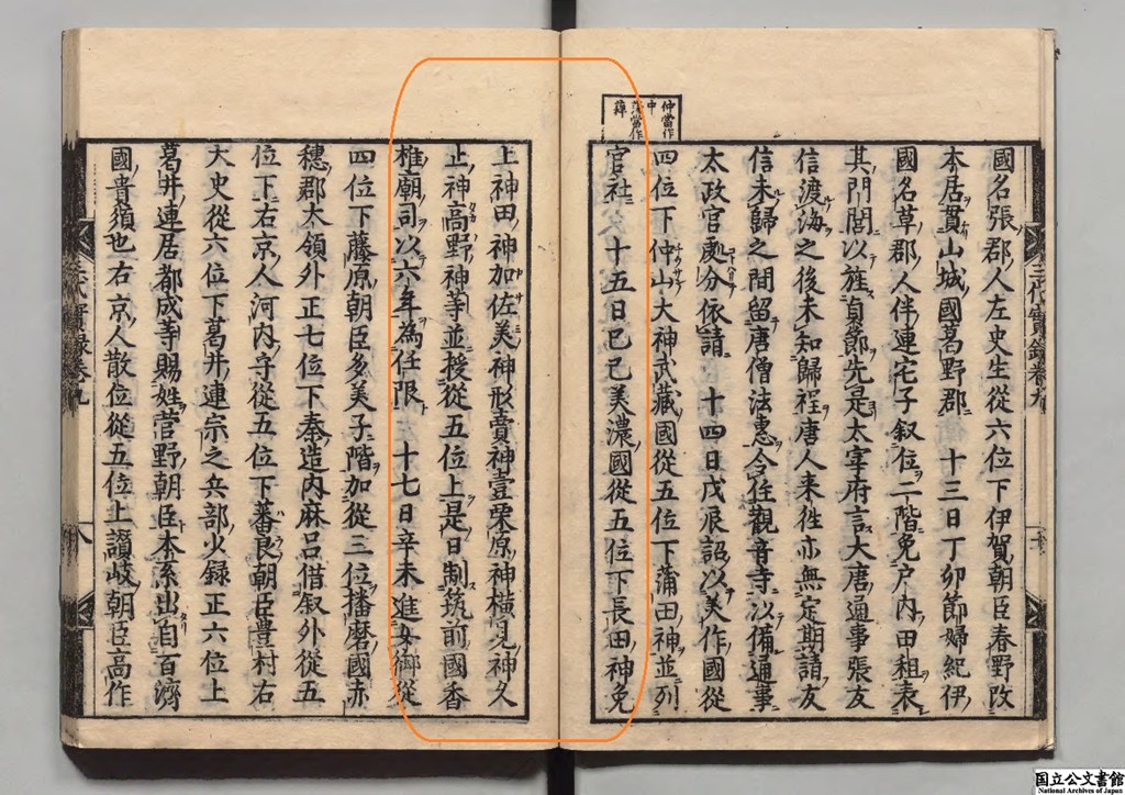 同十七年月廿九日壬子 晦授 美作國從五位上 高野神 正五位下