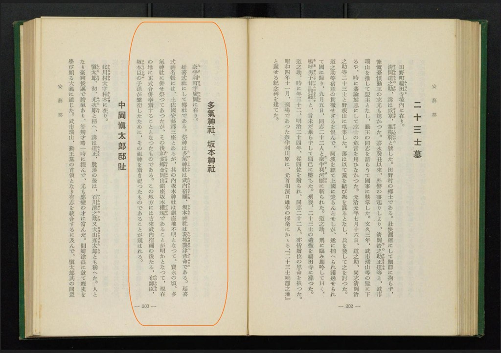 式内社 多氣神社について 所在は゛今 奈半郷奈半利村に在り、嶽明神と云ふ゛〈現 多氣神社・坂本神社(安芸郡奈半利町)〉と記しています