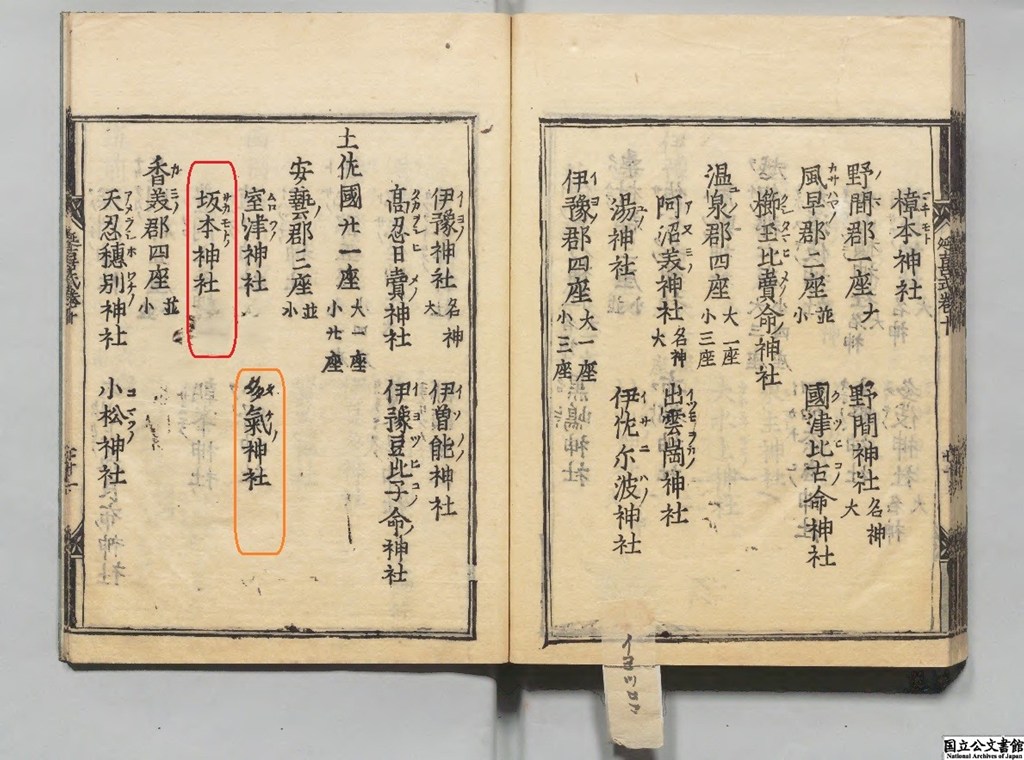 兩社 共に當郡 著姓 阿支奈臣 幷 坂本臣の遠祖を祀れる所とす、土佐國式社考云、
