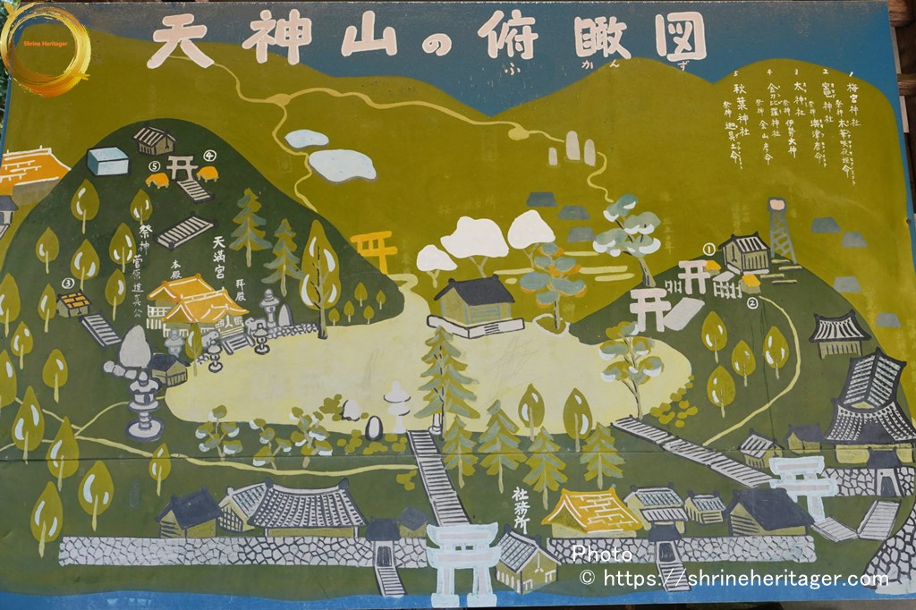 加悦町字加悦小字大神山鎭座、郷社 (關版参照)祭神 菅原道眞公 大巳貴命 少彦名命、元四辻村天神ケ鼻にありしを嘉歴三年當町宮野森ノ木に遷し 天正十四年安艮山城主有言省宥、毛利和泉守、細田安藝守三上宗三等 力を合せ今の地に奉遷し 大巳貴 少彦名兩尊を此時より相殿に祀る