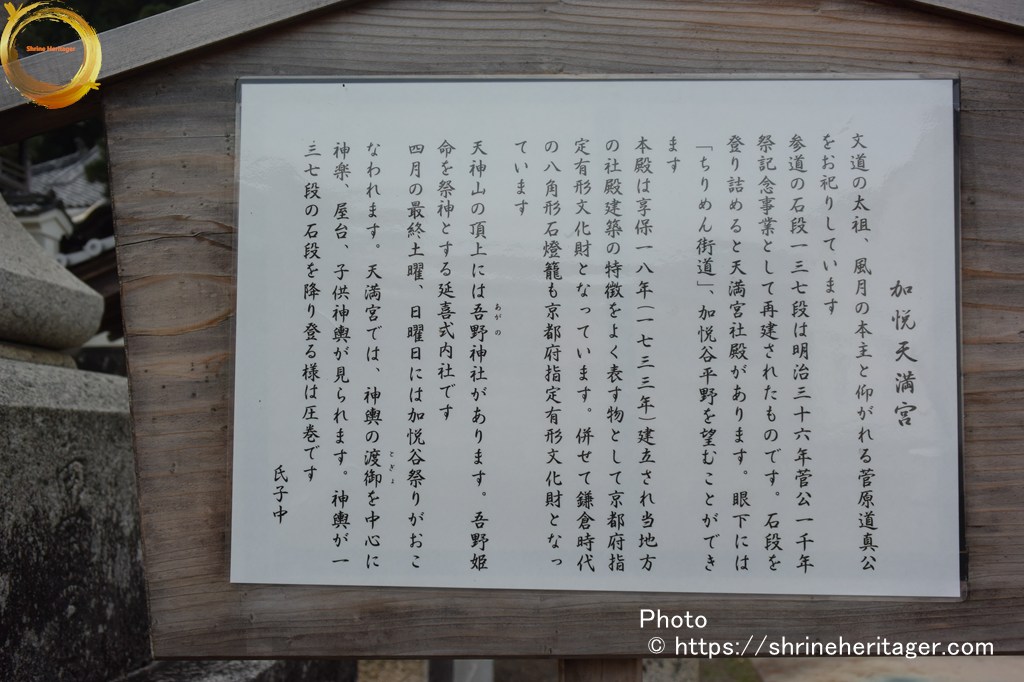加悦天神山に鎭座、菅原道眞公を祭神とし明治六年二月十日豐岡縣より村社に列せられ、大正十年三月二日昇格して今 郷社なり。