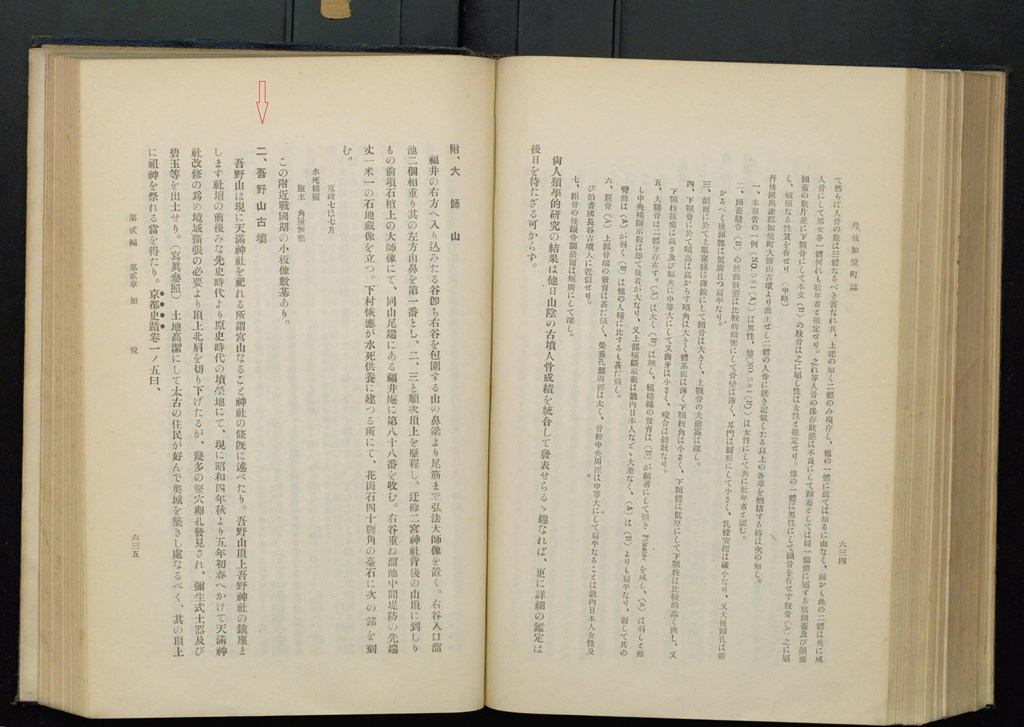 吾野山は現に天満神社を祀れる所謂宮山なること神社の條既に述べたり。吾野山頂上吾野神社の鎭座まします社壇の前後みな先史時代より原史時代の墳塋地にて、現に昭和四年秋より五年初春へかけて天満神社改修の爲め境域拡張の必要より頂上北肩を切り下げたるが、幾多の竪穴卵孔發見され、彌生式土器及び碧玉等を出土せり。 (爲眞容照 )土地高潔にして太古の住民が好んで奧城を築きし處なるべく、其の頂上に祖神を祭れる當を得たり。