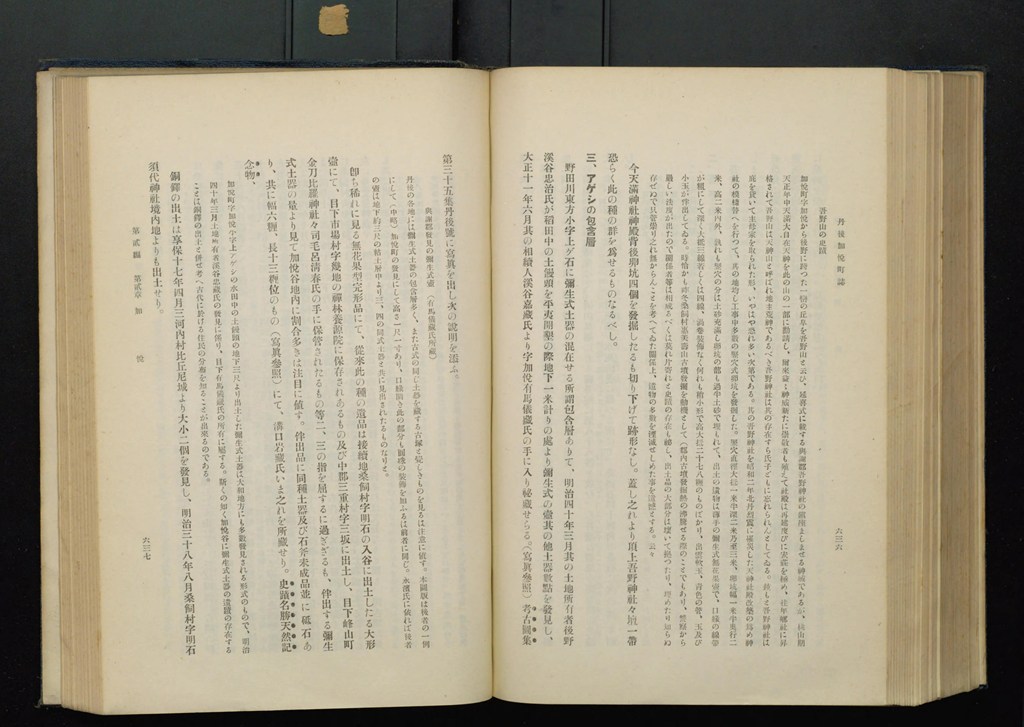 其の吾野神社を 昭和二年北丹烈震に罹災した天神社殿改築の爲め神社の模樣替へを行って、其の地均し工事中多数の竪穴式卵坑を發掘した。竪穴直径大抵一米半深二米乃至三米、卵坑幅ー米半奥行二米、高二米内外、孰れも竪穴の分は土砂充満し卵坑の部も過半土砂で埋もれて、出土の遺物は薄手の彌生式無花果壷で、口綠の線帯が粗にして深く大抵三線若しくは四線、渦卷装飾なく何れも梢小形で高大抵二十七八糎のものばかり、出雲軟玉、靑色の管、玉及び小玉が伴出してゐる。時恰かも昨冬桑飼村恵美壽山古墳發掘を動機として (郡内古墳發掘熱の沸騰せる際のことでもあり、警察から嚴・しい法度が出たので關係者等は相成るべくは莫れ片寄れと史蹟の存在も祕し、出土品の大部分は壊いて拠ったり、埋めなり知らぬ存ぜぬで只管崇り之れ無からんことを考へてゐた関係上、遺物の多數を湮減せしめた事を遺憾とする。云々