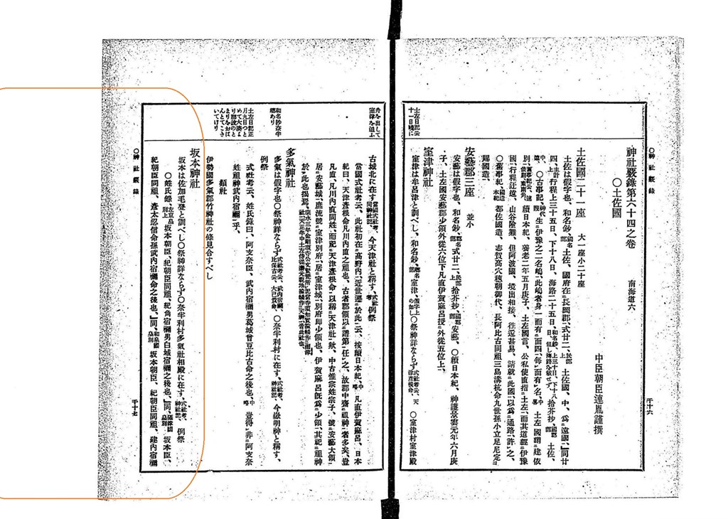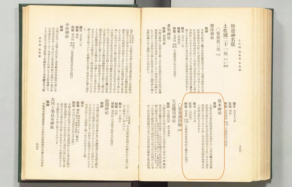 式内社 坂本神社について 所在は゛奈半利村 多氣社相殿に在す、゛〈現 多氣神社・坂本神社(安芸郡奈半利町)〉と記しています
