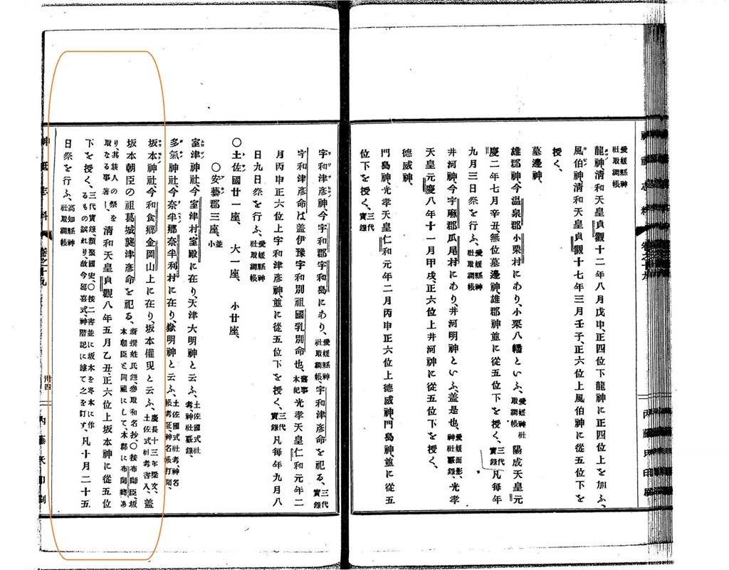 清和天皇 貞観八年五月乙丑、正六位上 坂本神に從五位下を授く、〔三代実録、類聚國史、○按二書並に坂本を嵜本に作るもの誤れり、故今 延喜式、神階記に據て之を訂す、〕