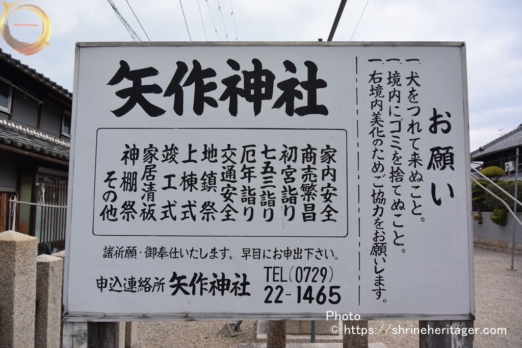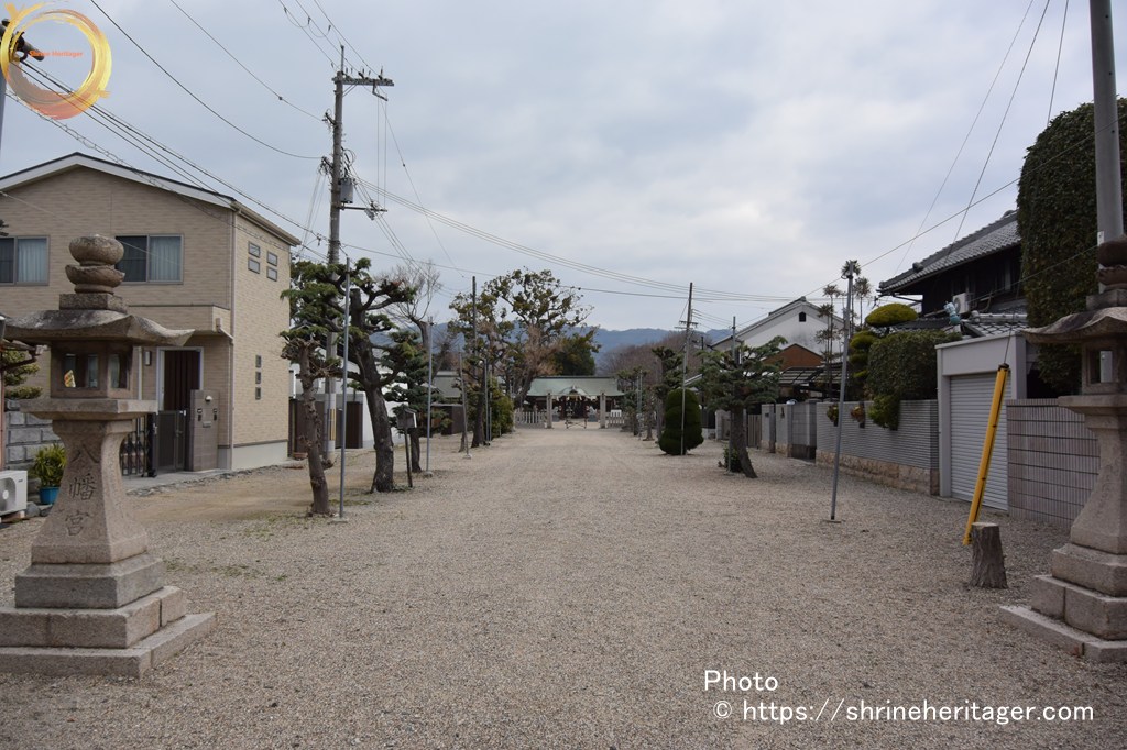 年代詳ならずと雖も、國に布郡努志命の裔なる矢作連なるもの住みたる事 姓氏録に見ゆれば、此等が其祖神を祀り創めたるものなる事は推定せらるべきが如し、住吉神三座の合祀せられ給ひし年代亦明なら、醍醐天皇 延喜の制小社に定まり、若江郡二十二座の内に加へらる(延喜式)、後朱雀天皇 長久年間 品陀和気命を合祀す(社記)、其後の沿革明かなら、俗に八幡とす(河内志)、明治年郷社に列す、境内九百十餘坪(官有地第一種)、社殿は本殿。拝殿、幣殿、神輿舎等の建物を備ふ。