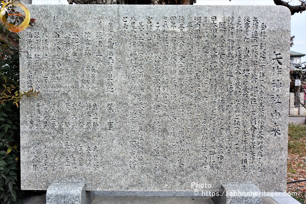 当社は創建は不詳であるが、主祭神 経津主神の後裔である矢作連の一族は早く此の地に住して朝命を受け矢作り業に從事した。当時この地方は豪族 物部氏の繁栄に伴ない祖先を氏神として経津主命を祭祀したものと伝えられている。