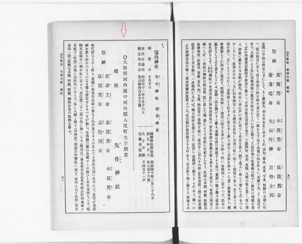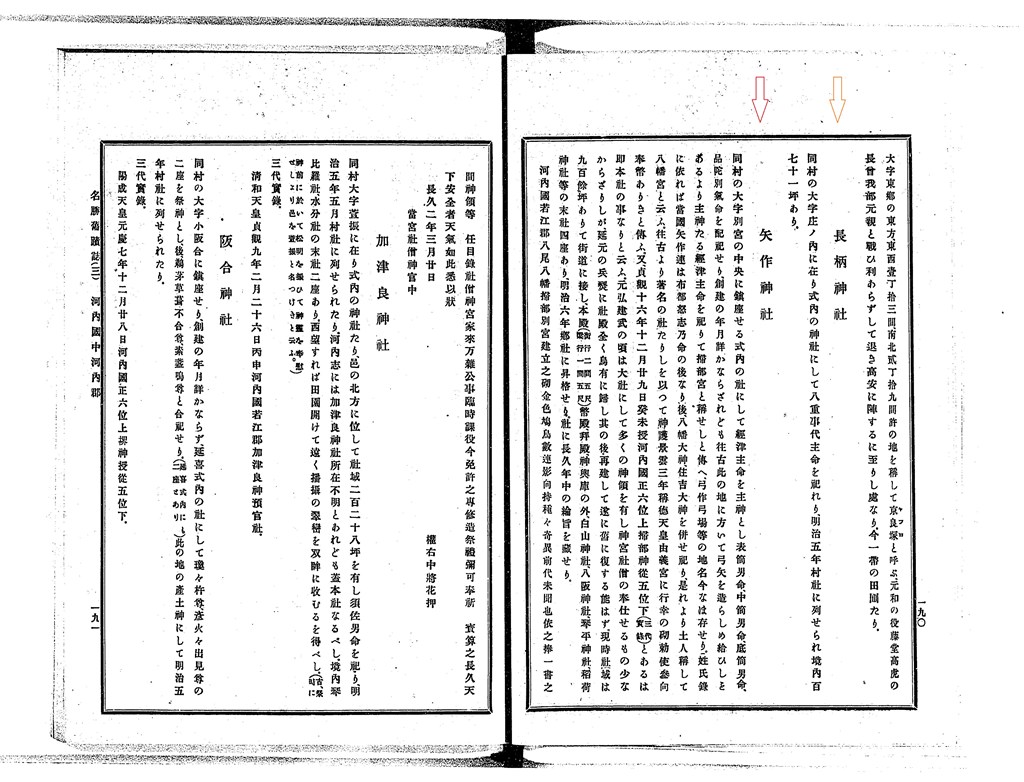 式内社 矢作神社について 所在は゛別宮村 (中河内郡八尾町大字別宮)゛〈現 矢作神社(八尾市南本町)〉と記しています