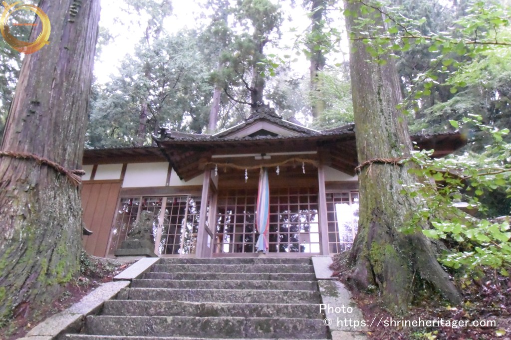 本社を距ること東南二十丁余(2キロ余)清流山宮川の水源神山の麓にあり千古の老杉二本、神木として連立している。本殿は、春日造、檜皮葺にしてその結構すこぶる壮麗である。