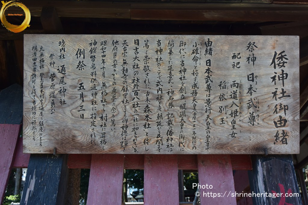 今按 社傳 祭神 日本武尊と云るは 倭字に附会したること著く 一説 倭文神 建葉槌神と云るは 秘釋に倭文に作るを以て云出たるなれば 共に従がたし 猶よく学べし