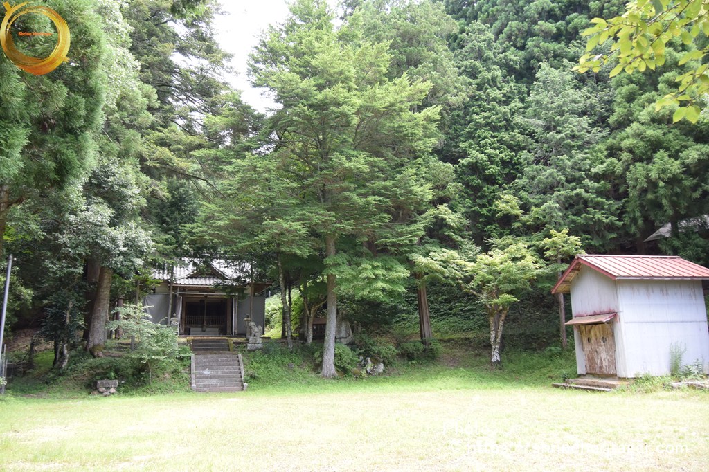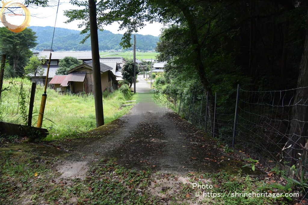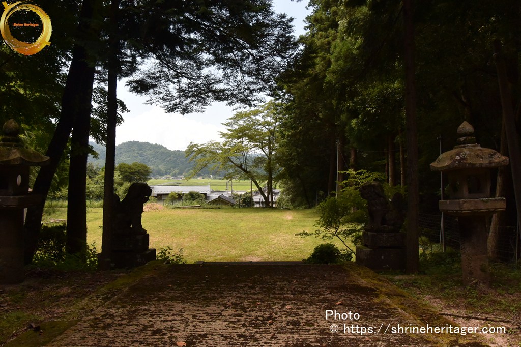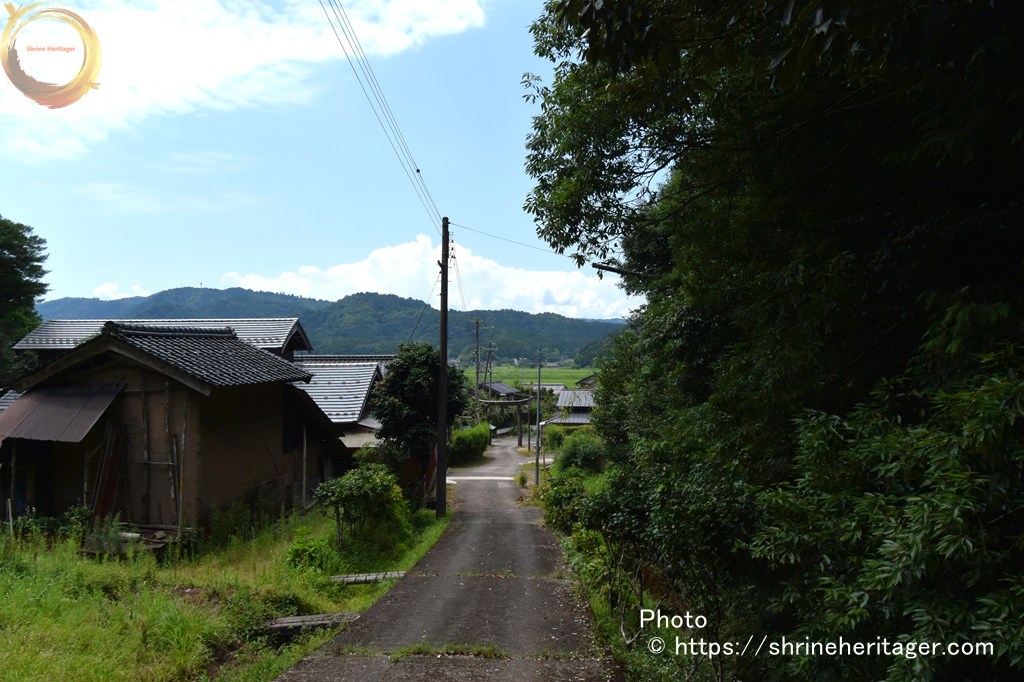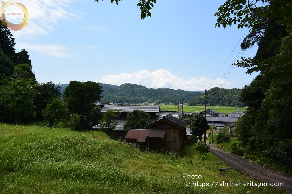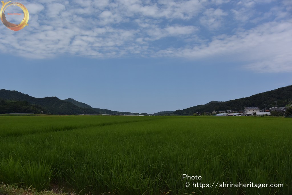 100m程の ゆるやかに上る参道を進むと 境内はちょっとした高台となっていて 川上谷川の流れる谷間の平地に水田が広がっている様子がわかります
