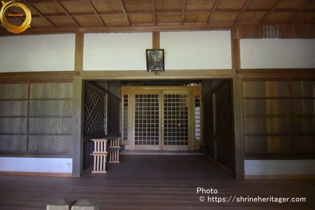 一 拝殿 切妻造檜松材屋根萱葺 建坪八坪六合七勺