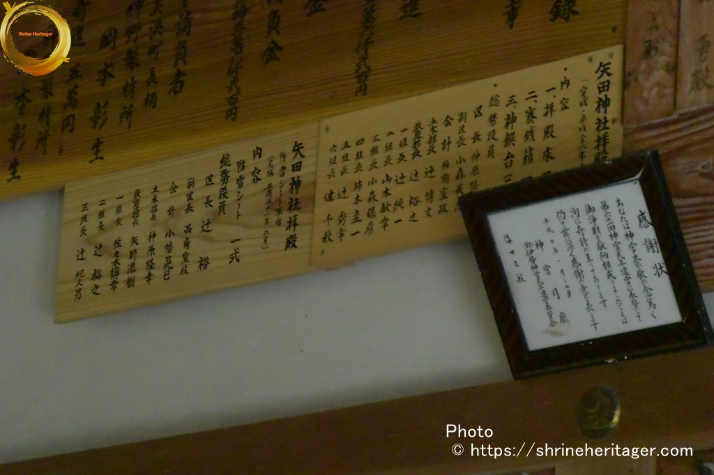 【豊岡縣式社未定考案記】佐野村 八幡社ヲ矢田八幡ト記セル年號無之書付一枚アリシヨリ 今般双方 式社ノ申立アレドモ 海士村ノ儀ハ古来ヨリ矢田明神ト唱ヘ来リ 且ツ文永天正等ノ棟札ニモ 矢田神社トアレバ 海士村ヘ決定可然
