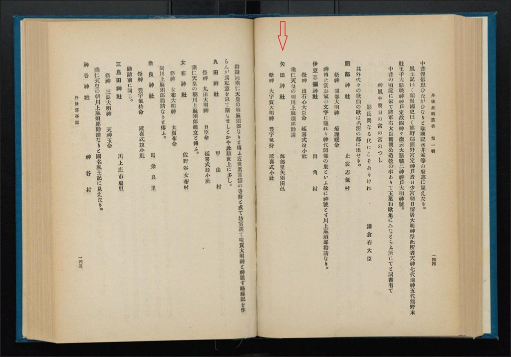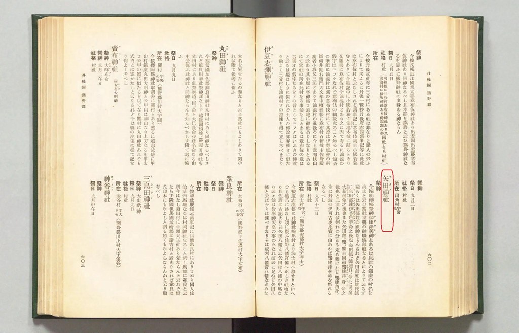 今按 明細帳 祭神 和田津美(ワタツミノ)神とあるは 此社の鎭座の村名を海士と云ひ 當社世襲の神職 海部直なるとによりて云るが 疑らくは矢田部姓の祖神ならん されど矢田部姓は姓氏録に矢田部連(ヤタベノムラジ)一伊香色乎命(イカツシコヲノミコト)之後也 矢田部ハ饒速日ノ命七世ノ孫 大新河命之後也 また 矢田部ハ鴨ノ縣主 同祖 鴨建津身(カモタケツミノ)命 之後也と 二流あれば何れの分とも定め難けれど 鴨建角身ノ命は丹波の伊可古夜比賣に由あれば 鴨建津身命を祭れるなるべし