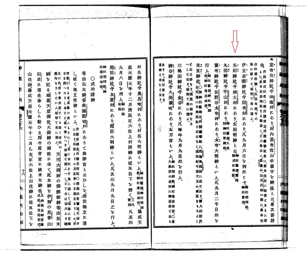 今 酒士村にあり、矢田明神と云、〔神社覈録、豊岡縣式社考証、〕